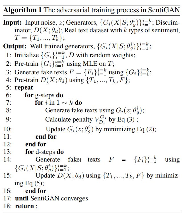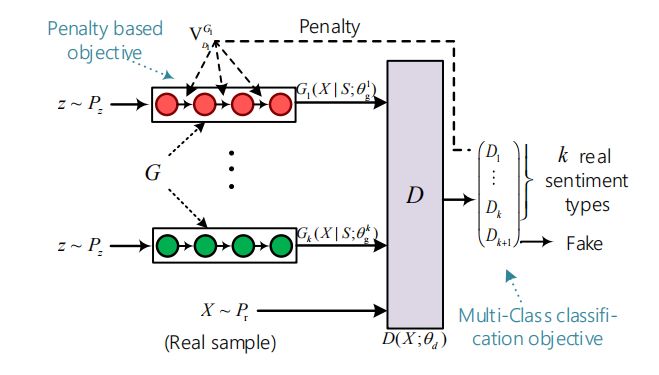 (2) 我们提出了一个新的基于惩罚的目标函数,让 SentiGAN 的每个生成器都能为特定情感标签产生多样性的文本。