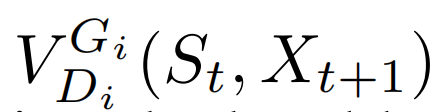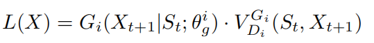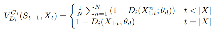 由于判别器只能鉴别一个完整的句子,因此我们采用蒙特卡洛搜索和 roll-out 策略对剩下的 X-t 个未知单词进行采样。因此,我们的第 i 个生成器的惩罚函数计算如下: