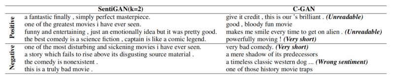 表 5 SentiGAN 和 C-GAN 在 MR 训练数据集上生成的样例语句