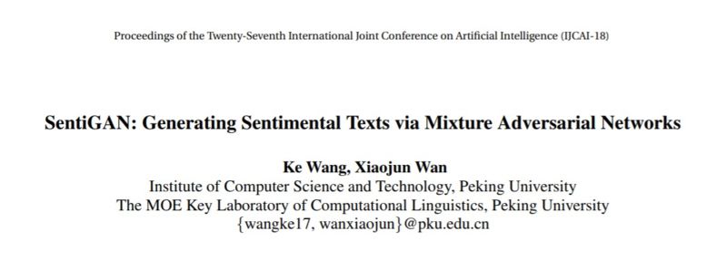 在上午的开幕式中,大会公布了杰出论文(Distinguished Paper)。与往届不同,今年的 IJCAI 大会未颁发“最佳论文”、“最佳学生论文“等奖项,而是 7 篇杰出论文。本文选择了北京大学计算机科学技术研究所的《SentiGAN: Generating Sentimental Texts via Mixture Adversarial Networks》进行解读。