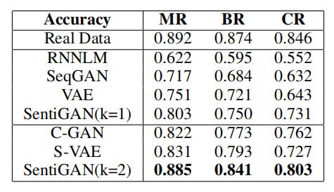 我们使用先进的情感分类器来自动评价生成文本的情感准确度。我们与多个文本生成网络进行比较,包括 RNNLM、SeqGAN、VAE、C-GAN 和 S-VAE。为了说明用多个生成器和单个生成器的区别,我们也对比了 SentiGAN(k=1)。