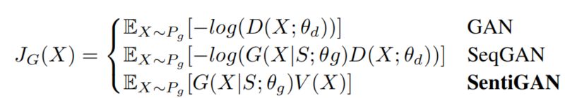 这里我们介绍惩罚项如何使生成器产生多样性的样本,而不是仅仅产生重复的且“安全”的样本,从而帮助提升生成文本的多样性和质量。我们对比了 GAN、SeqGAN 和 SentiGAN 的生成器目标函数: