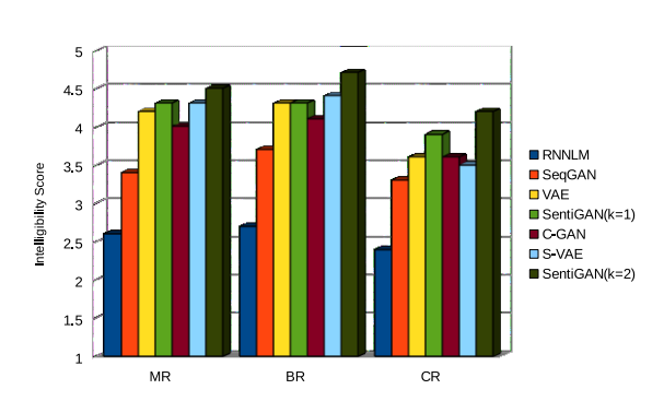 智能性:我们用人为评价来衡量生成文本的智能性。我们从生成句子中随机提取了 100 个句子,然后让三个研究生根据其智能性对它们进行评价。分数从 1 到 5,5 分为最高。