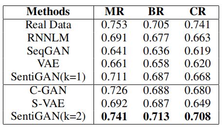 可以看出我们所提的模型表现超过了所有其他方法,说明带有多个生成器和一个多类判别器的框架可以让每个生成器更好的生成自己的情感文本。除此之外,SentiGAN(k=1) 和 SentiGAN(k=2) 的对比说明多生成器极大提高了生成文本的情感准确度。