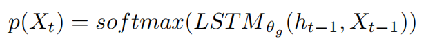 除此之外,我们的生成器是 LSTM 的简化层,根据如下分布生成第 t 个单词: