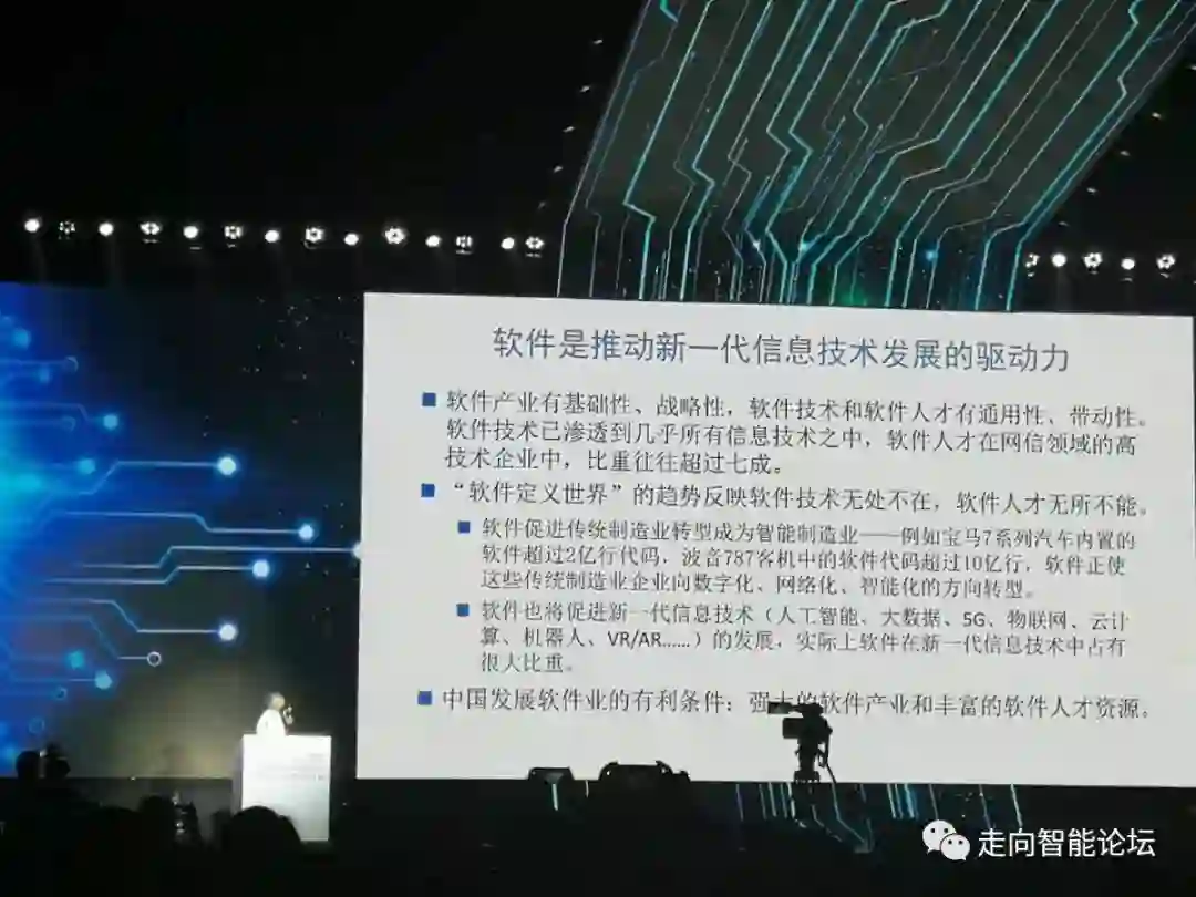 我下面讲的是整个软件在当前新一代信息技术发展之中,我认为软件是一个非常重要的,过去我们强调基础性、战略性,现在应该说新一代信息技术往往都和软件有很大的关系。我们以前到华为、中兴调研,十多年以前,发现在信息通信领域,这些工程技术人员和科技人员大概70%以上是从事软件的。我最近碰到华为一些负责人说,他们现在研发人员大概八成以上是软件的,这个趋势是不是软件的成分越来越多,在新一代信息技术发展的阶段,还有待于大家去调查研究,这是一个感觉,可能是对的。我们知道所谓软件定义世界、软件定义一切,这种口号现在有夸大的地方,但说明软件相当于基础性和通用性,所以很多传统企业都说现在是软件企业,他觉得这是很光荣,说明对企业赶上了发展的时代步伐。