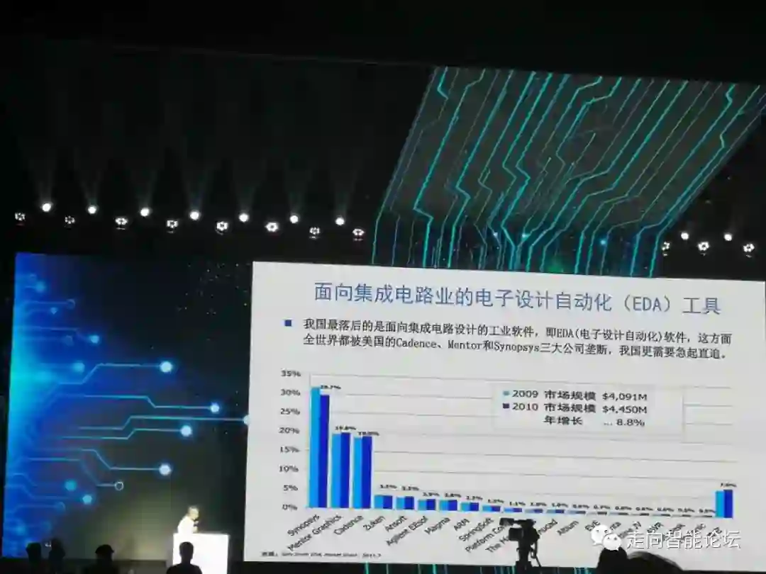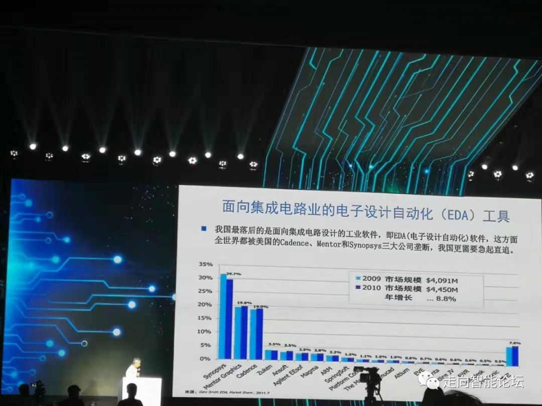 EDA来讲是非常重要的,这次我们看到在华为在被制裁中,工业软件也受到了制裁,我们觉得这是一个很重要的问题。假如说我们目前设计水平还可以,芯片设计企业非常多,人也很多。但我们所用的设计软件,大家看这个市场曲线,前3家就是美国公司,我们设计软件基本上都是这3家垄断了。我们为什么没有起来呢,中国目前那么长时间在做的还有一家,华大,现在的华大九天,这几十年它都在做,最近有一些新的起来了。