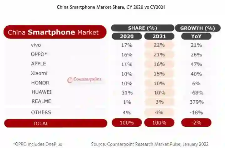 然而,2021年IDC等权威调研公司数据中,vivo却逆势增长。该报告显示,在中国前五大智能手机厂商中,vivo的全年市场份额稳居国内第一,同比增幅达23.3%。