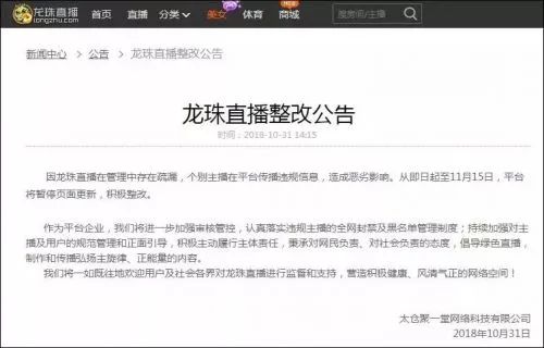 【TechWeb】11月1日消息,10月31日,龙珠直播发布公告称,因在管理中存在疏漏,个别主播在平台传播违规信息,即日起至11月15日,将暂停页面更新,积极整改。