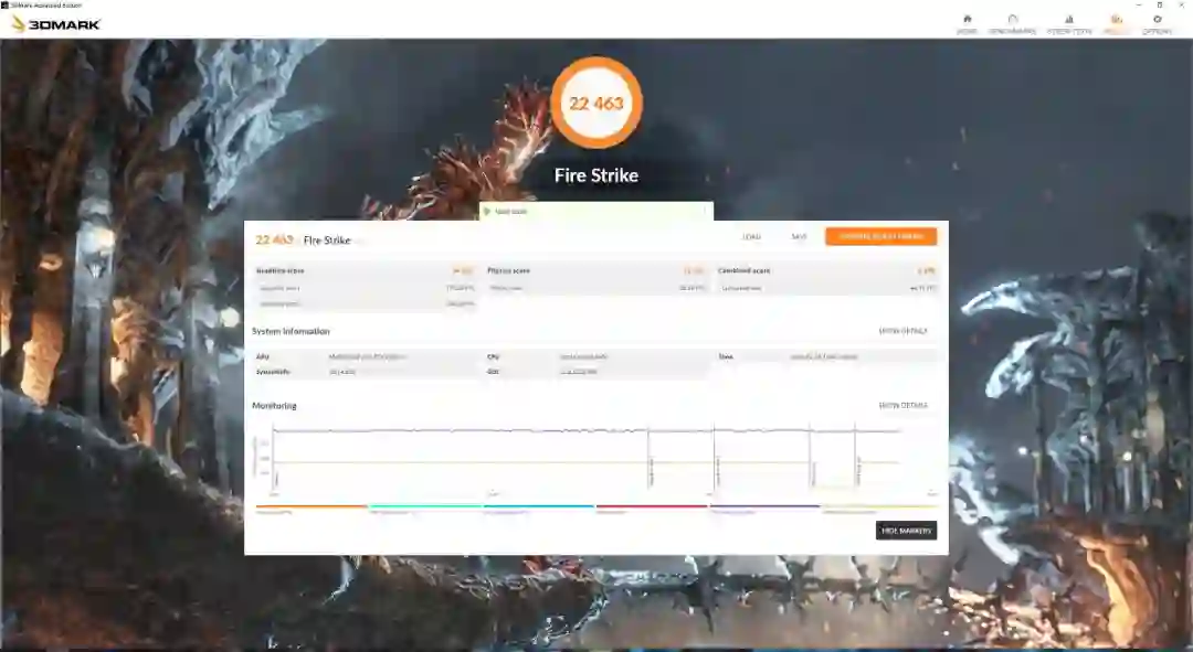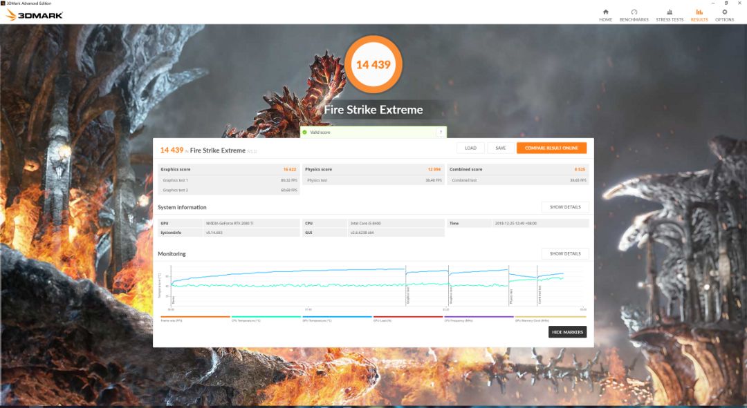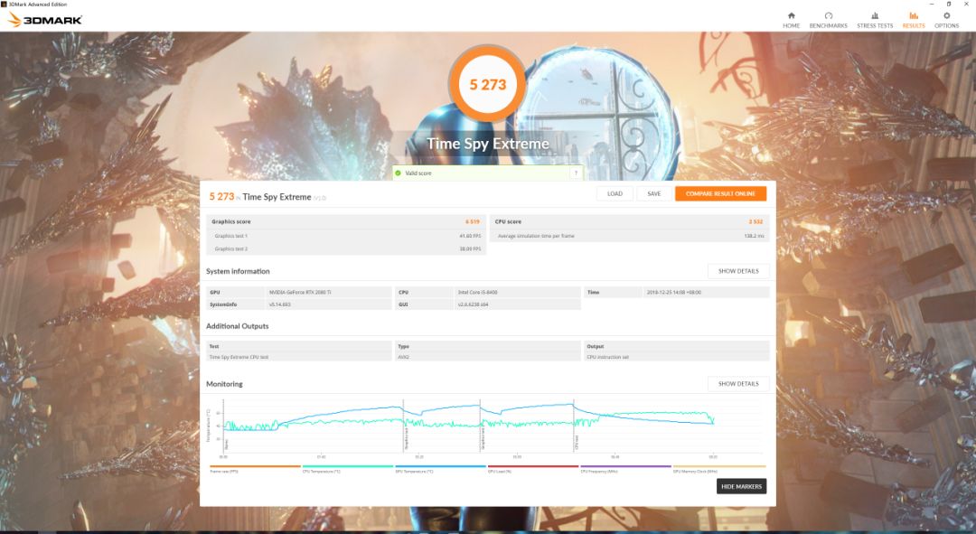 接下来,我们来看看RTX 2080Ti在3DMark各个项目的表现,我们可以看到FS GPU分数为22463,FSE GPU 2K分数为14439分,FSU GPU 4K 分数为7812分,而TimeSpy E的分数为5273分。