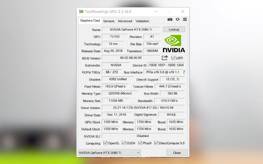 我们从GPU-Z的截图可以看出RTX 2080 Ti相比之前的GTX 10系列变化最大的地方,就是架构升级。在Pascal(帕斯卡)架构服役了两年之后,我们终于等来了新一代的Turing(图灵)架构,尤其是在用上了12nm工艺之后,RTX 20系列中核心面积最大的GPU——TU102集成了189亿个晶体管,比GTX 10系列中的GP102面积大了60%,数量增加了55%。这还是有一部分划分给了光线追踪核心和张量核心的前提下,总面积754mm²也是迄今为止英伟达最大的游戏显卡核心了。