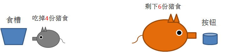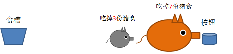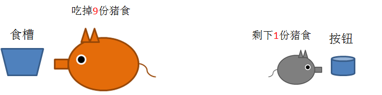 话说在一个猪圈里,住着一只大猪和一只小猪。猪圈的一侧有个食槽,相反一侧是一个按钮,每次按下按钮(一段时间内只允许按一次),食槽里就会出现10份猪食。