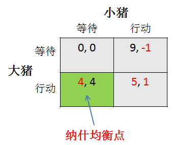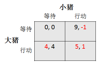 既然大猪无论如何都只能行动,那小猪还有行动的必要吗?如果小猪等待,收益是4;如果行动,收益是1,显然小猪最佳的策略仍然是等待。