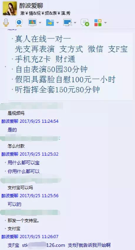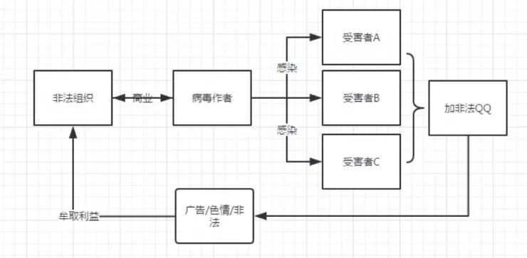 首先,非法组织找到了病毒木马作者,达成了合作的关系,于是在下载站,网盘等地投放病毒,受害者中招后,莫名其妙的加了一些不认识的QQ好友,这些好友,会在QQ空间和QQ群里投放一些“色情”广告,如果有用户抵挡不住 诱惑,按照广告中提示要求加了指定的QQ号(QQ的背后可能是一位扣脚大汉),对方会以诱惑性的美女图片来诱惑用户观看视频,用户需要支付价格在50RMB~150RMB的金额才能进行体验。而实际收款的却是扣脚大汉!