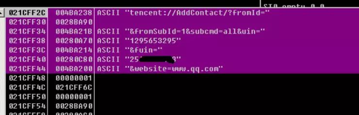 c.获取完QQ号码后,启动Timwp.exe进程并传入相应的参数完成添加”tencent://AddContact/?fromId=5&fromSubId=1&subcmd=all&uin=1295653295&fuin=256*****53&website=www.qq.com”