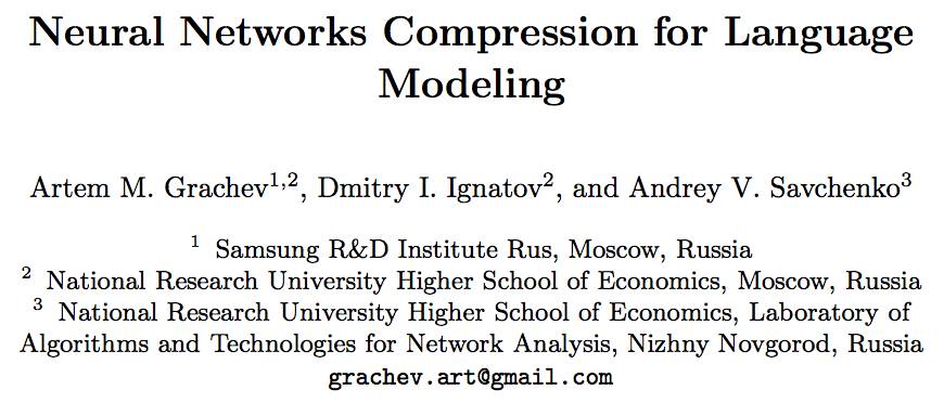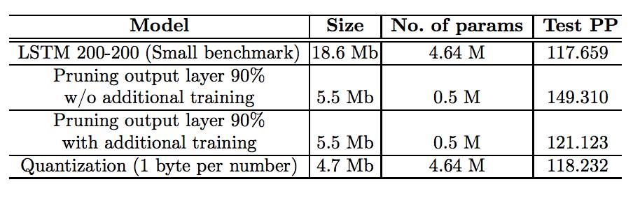 在此论文中,我们考虑语言模型神经网络压缩的多种方法。文章第一部分介绍剪枝与量化方法,结果显示这两种技术应用于语言模型压缩时毫无差别。文章第二部分介绍矩阵分解方法,我们演示了在设备上实现模型时,这些方法的优势。移动设备任务对模型大小与结构都有严格的限制。从这个角度来看,LR LSTM 650-650 模型有更好的特性。它比 PTB 数据集上的最小基准还要小,且其质量可与 PTB 上的中型模型媲美。