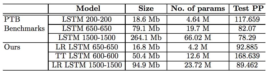 但是,当用模型进行推理时,还存在其他问题。这些问题是由稀疏计算的高计算时间造成的。有一种解决方式是使用神经网络中不同的基于矩阵的方法。因此,Lu, Z 等人 2016 年 ICASSP 的论文提出基于使用 Toeplitz-like 结构化矩阵的方法。此外还有其他的矩阵分解技术:低秩分解、TT 分解(张量训练分解)。Yoshua Bengio 等人 2016 年 ICML 论文提出的 uRNN(Unitary Evolution Recurrent Neural Networks)也是一种新型 RNN。