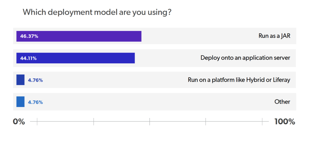 在这个问题中,我们要求受访者报告他们使用的是哪种部署模式。最受欢迎的部署模式(占 46%)是将应用程序作为 JAR 运行。44% 的受访者报告称他们部署到应用服务器上,而 5% 的受访者报告他们使用了 Hybris 或 Liferay 等平台来部署他们的应用。
