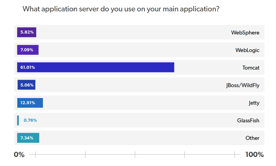 各种应用服务器是否正在消失?我们的调查结果表明,开发者使用 Tomcat 的速度几乎是最接近的竞争对手的五倍。61% 的受访者表示,在他们的主要应用程序上使用 Tomcat,很明显,Tomcat 是占主导地位的应用服务器。排名第二的应用服务器是 Jetty,占 13%;而 WebLogic 和 WebSphere 的使用率分别为 7% 和 6%。排在最后的是,JBoss/Wildfly 的使用率为 5%。