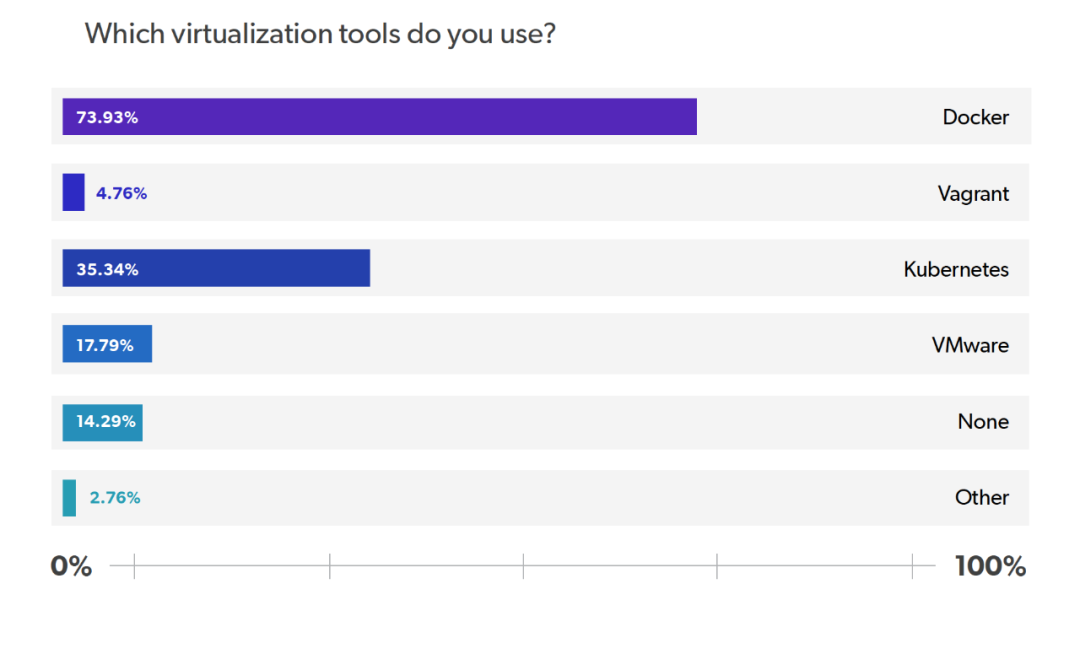 随着 Kubernetes 的发展,它在未来几年将在市场上占主导地位也就不足为奇了。VMWare 和 Vagrant 是最后两个使用率最高的工具,使用率分别为 18% 和 5%。最后,有 14% 的受访者表示没有使用虚拟化工具。