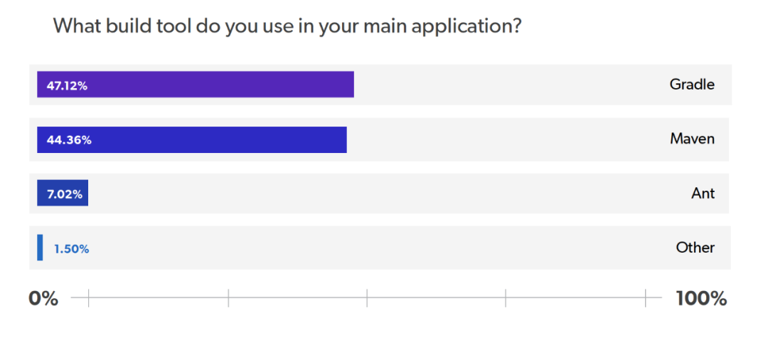 对于构建工具,我们要求开发者选择他们在主应用程序中使用的工具。不出所料,Maven 和 Gradle 是最常用的工具。但是,也许反映了在移动开发领域工作的受访者的数量,Gradle 在这两者中更受欢迎。我们认为这并不能反映出 Maven 和 Gradle 被采用的现实,但无论如何,这都是一个有趣的现象。我们的调查发现,47% 的受访者使用 Gradle 作为他们主要应用程序的构建工具,而 44% 的受访者表示使用 Maven。Ant 的使用率都低于这两个数字,均为 7%。