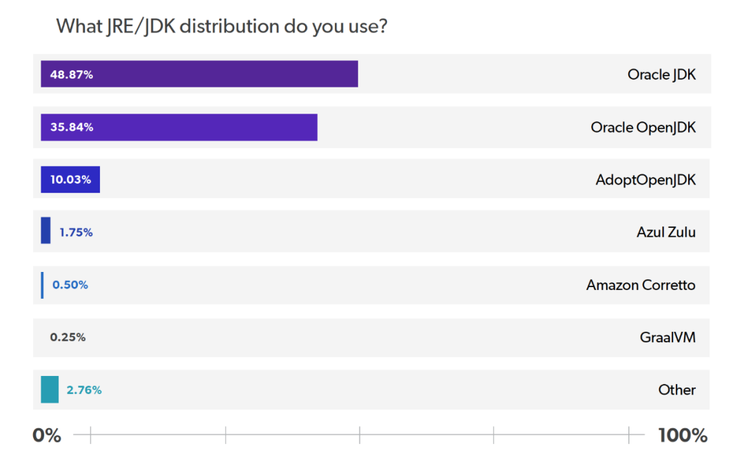 我们认为这可能出于两个原因:1. 在我们的调查中有大量的 Java 8 开发者。我们认为,使用 Java 8 的开发者数量表明,该项目在很长一段时间内没有更新了,这可能是使得应用程序保持在 Oracle 发行版的原因。2. Oracle JDK 提供的支持可能比我们想象的更重要。