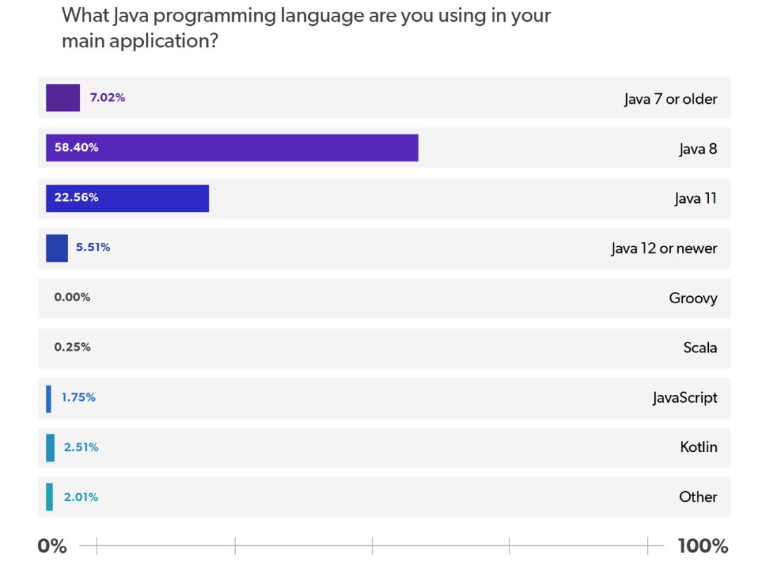 58% 的受访者表示,他们在主要应用程序中选择 Java 8 作为编程语言。而 Java 11 以 23% 的受访者位居第二。7% 的受访者表示使用 Java 7 或更早版本,另有 6% 的受访者表示使用 Java 12 或更高版本。Kotlin 和 JavaScript 的使用率最低,分别为 3% 和 2%。