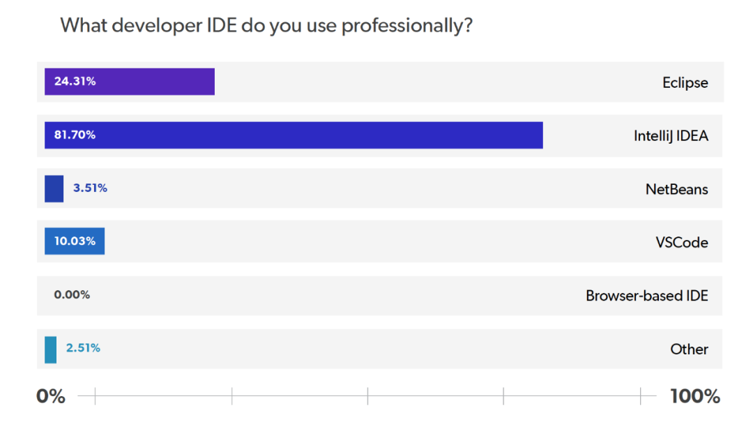 但是,有 82% 的受访者表示他们使用 IntelliJ IDEA ,很明显,这个付费的 IDE 非常值得一试。第二个最常用的 IDE 是 Eclipse,占 24%,而 VSCode 占 10%。最后,有 4% 的受访者表示,以专业身份使用 NetBeans。这些年来,NetBeans 真的失去了所有的兴趣,甚至连 VSCode 在这次调查中都超过了它。