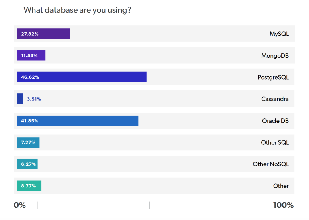 在这个问题中,我们要求受访者选择他们当前使用的数据库。最受欢迎的是 PostgreSQL,占 47%,紧随其后的是 Oracle DB,占 42%。接下来是 MySQL,有 28% 的受访者报告了使用情况。MongoDB 位居第四,在受访者中占 12%。使用最少的数据库包括 SQL、NoSQL 和 Cassandra,使用率分别为 7%、6% 和 4%。