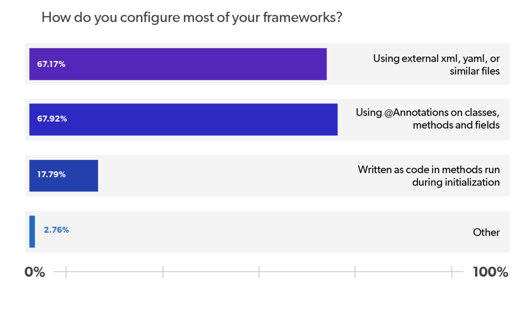 对于框架配置,我们发现大多数受访者在类、方法和字段上使用 @Annotation,或者使用外部 xml、yaml 或类似文件。68% 的用户表示使用 @Annotation,67% 的用户表示使用外部 xmlL、yaml 或类似文件。18% 的受访者使用在初始化期间运行的方法中添加的代码进行配置。