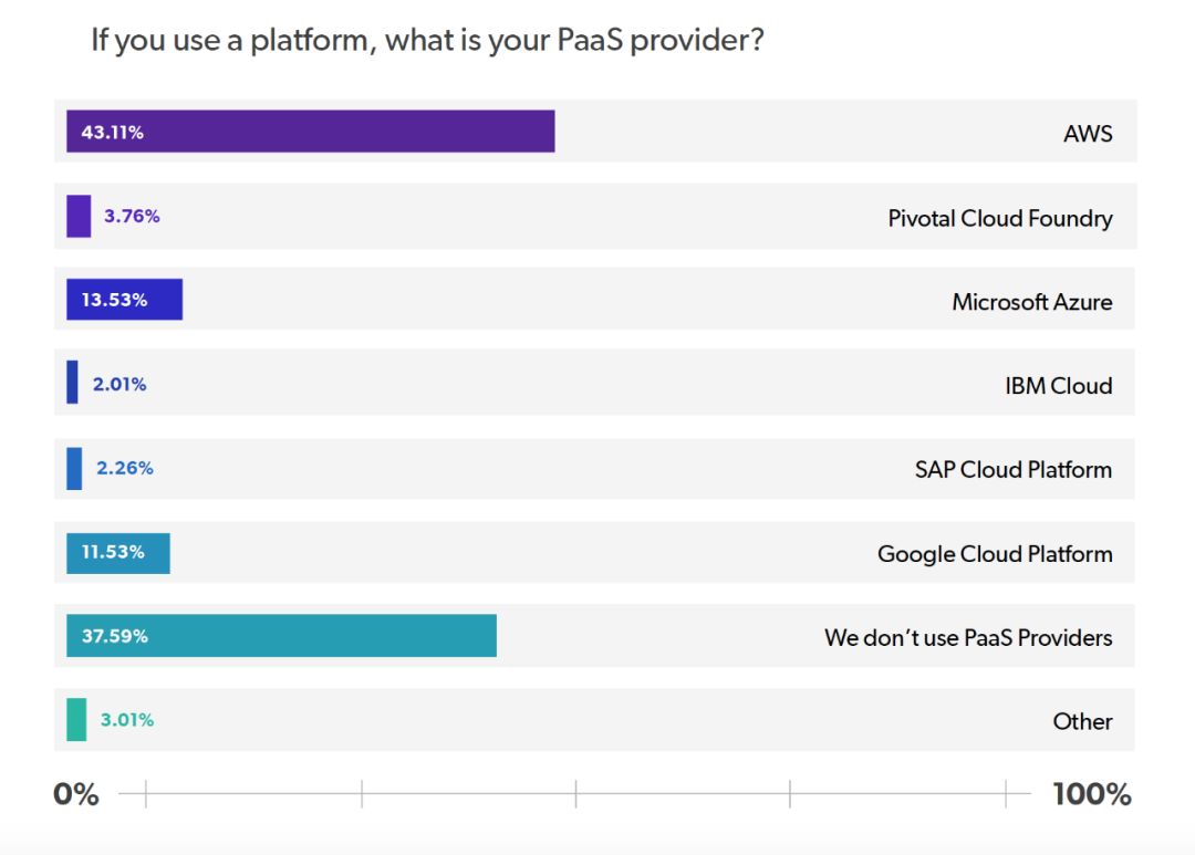 在这个问题中,我们要求受访者报告他们所选择的 PaaS 提供商。在使用 PaaS 提供商的 60% 受访者中,43% 选择 AWS,14% 选择 Microsoft Azure,12% 选择 Google Cloud Platform。选择较少的供应商包括 Pivotal Cloud Foundry,占 4%,SAP Cloud Platform 和 IBM Cloud 各占 2%。