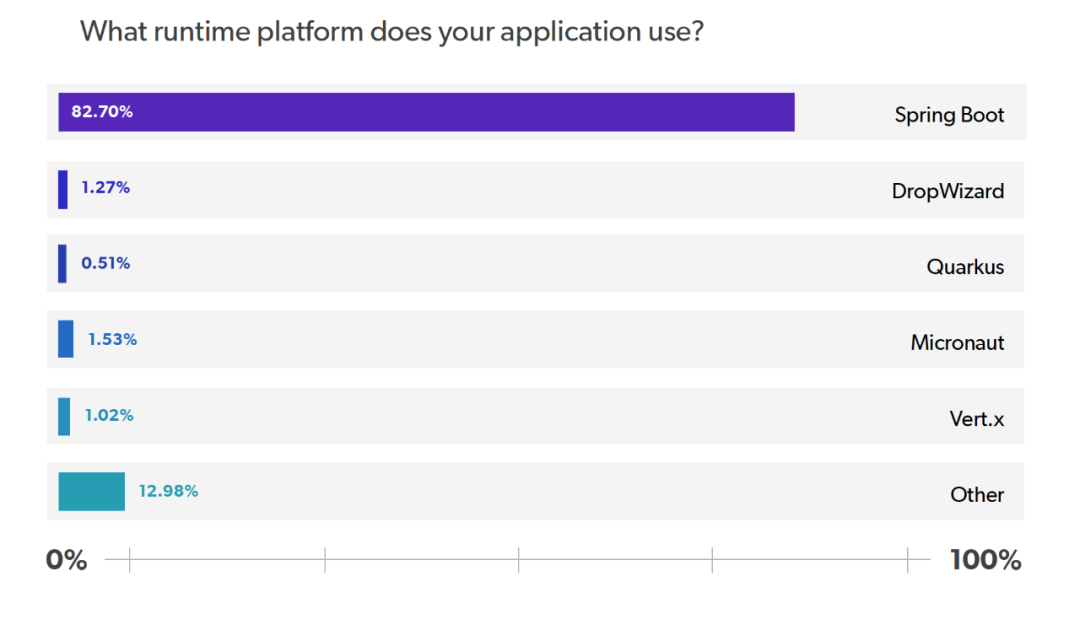 运行时平台最受欢迎的选择是 Spring Boot,占 83%。当然,多年来,Spring Boot 一直是首选的 Java 框架。这至少部分归因于近年来 Java 应用程序越来越多地采用微服务。在所有受访者中,Spring 以 2% 成为第二受欢迎的选择,而不使用运行时平台的受访者也占了 2%,打成了平手。使用 Dropwizard、Micronaut、Vert.x 或自定义平台的受访者各占 1%。
