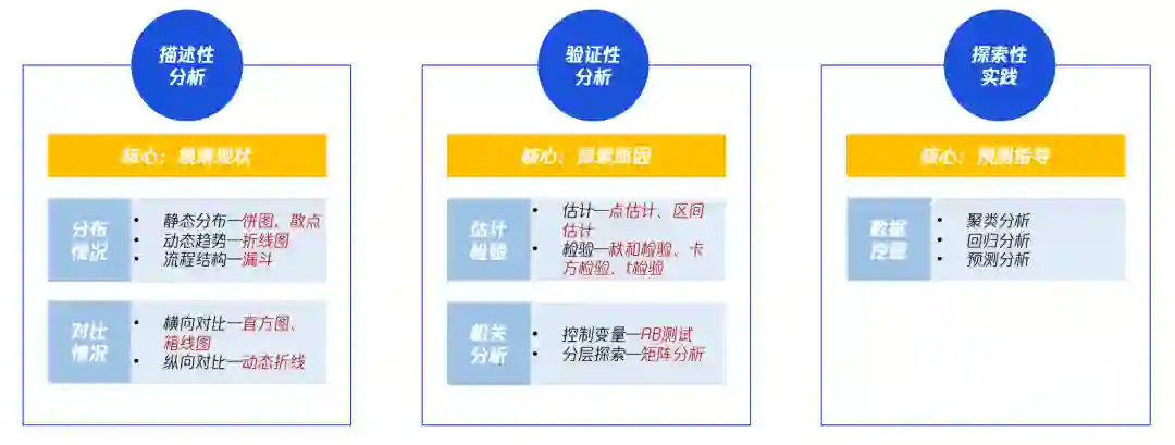 所以基于这三件大事,分别要做好的就是以描述性分析来刻画现状、以验证性分析来探索原因、以探索性实践来指导后续工作,在上图也做了简单的总结。