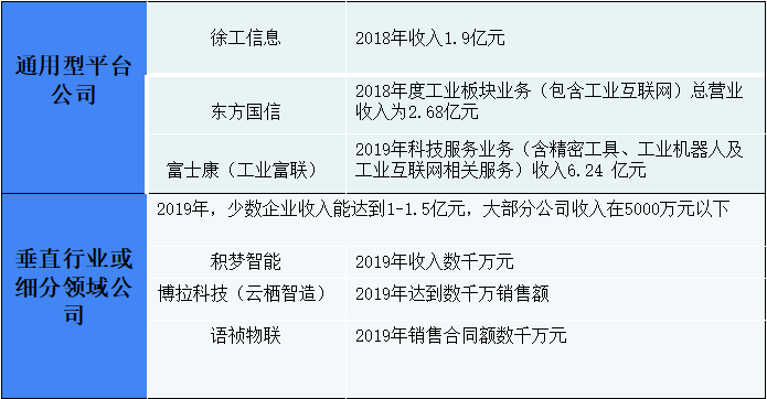 根据36氪业内访谈获得的信息,通用型平台类公司的收入普遍达到亿级规模,垂直或细分领域创业公司的收入水平则处在千万元级别。据鲸准数据库,目前“工业互联网”标签下的项目数是185家,剔除部分IT基础设施的软硬件供应商,本文所关注的工业互联网技术、产品服务商约100家左右。按照通用型平台15家,平均营收1亿元,其他类公司的平均营收3000万元的水平,则全行业收入总规模为40.5亿元,符合上文22.6-45.3亿元的范围。