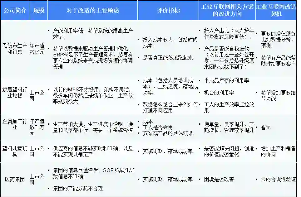 归根结底,工业互联网企业为客户提供数字化、智能化产品来创造价值,其收入也来源于为客户带来的效率提升、成本节约或者订单收入增加。我们采访了金属加工、无纺布生产制造、家居制造、医药等领域规模较大,且已经进行了工业互联网改造的制造业客户,总结了其工业互联网改造的契机以及相关评价指标: