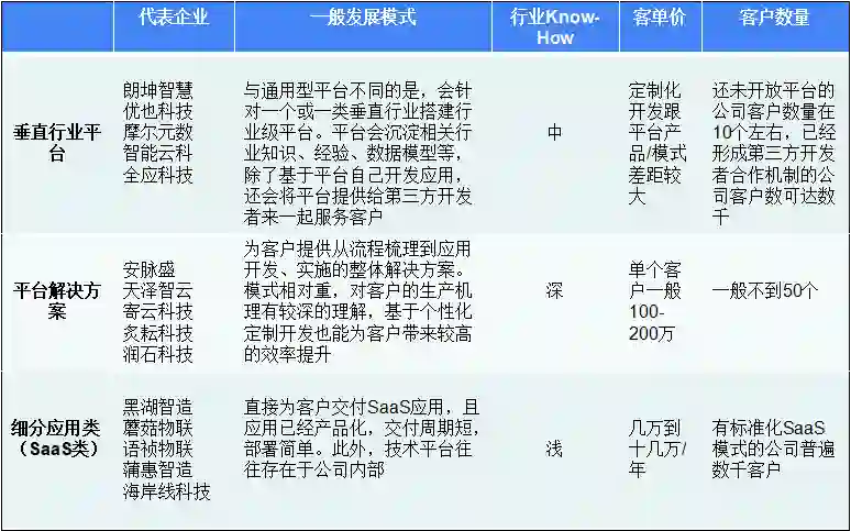 这里也要特别说明,工业互联网公司的业务范围及模式是不断变化的,而且有的企业面对不同客户有不同的模式。这里是以我们目前掌握的信息来做的大致分类。关于客单价、扩张速度等指标的分析也是便于理解各类模式的区别,并主要参考行业平均水平。事实上,同一模式下的不同工业互联网企业的客单价、扩张速度也会因为其下游客户所在行业、客户规模及需求等有较大差异。
