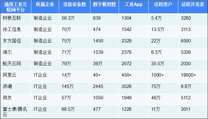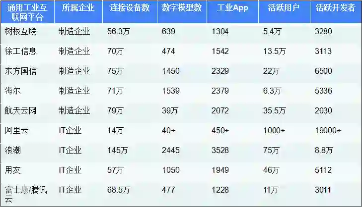 工信部2019年评选出了十大跨行业跨领域工业互联网平台,除了华为FusionPlant工业互联网平台,其他九家平台的发展数据如下。