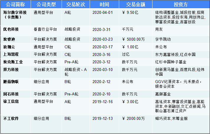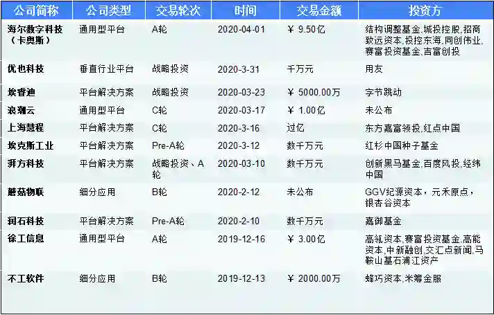 随着服务模式逐渐清晰,以及“新基建”政策推动,工业互联网近期在投融资市场迎来新热度。今年4月初,海尔旗下的卡奥斯工业互联网平台获得9.5亿元A轮融资,创下工业互联网平台A轮融资规模之最。去年12月至今年4月,赛道已发生过多笔融资。