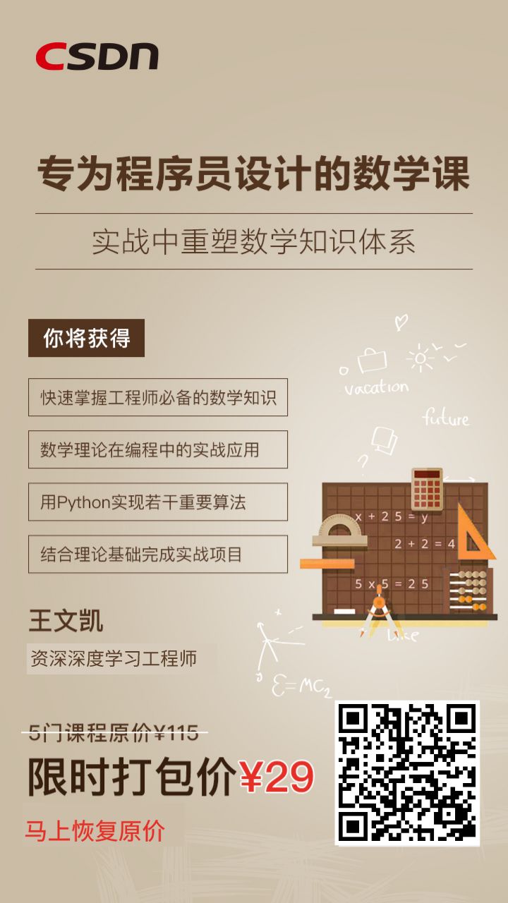 这门系列课由CSDN学院联合百度、阿里云资深深度学习讲师王文凯老师共同研发完成,期望解决你在数学上的一些问题。