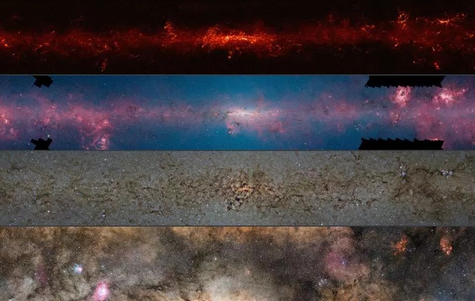 这四张图以四种不同波长的光线显示了银河系的中心区域,其中较长的(亚毫米)波长位于顶部,穿过远近红外线(第二和第三),并以可见光视图结束。可以注意到的是尘埃带和前景恒星在可见光下遮挡了银河系中心。图片来源:ESO/ATLASGAL consortium/NASA/GLIMPSE consortium/VVV Survey/ESA/Planck/D. Minniti/S. Guisard Acknowledgement: Ignacio Toledo, Martin Kornmesser