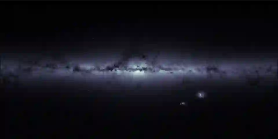 银河系和周围天空的星密度图,该图清晰地显示了银河系,大小麦哲伦云等。然而,在可见光的情况下,银河系中心因银河系平面中性物质对光的吸收而变得模糊不清。图片来源: ESA/GAIA