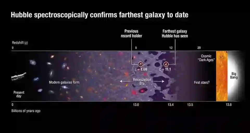 在我们目前的天文台中,我们看不到这些恒星,因为它们周围的中性物质阻挡了太多的发射光。在宇宙被重新电离之前,这意味着有足够的热紫外线发射恒星将这些中性原子转变成电离等离子体,然后紫外线和可见光就不能通过。一般来说,宇宙在500-550亿年之前不会被重新电离,也就只有通过运气,我们才能观测到恰好位于早期发生重新电离的空间区域的GN-z11古代银河。