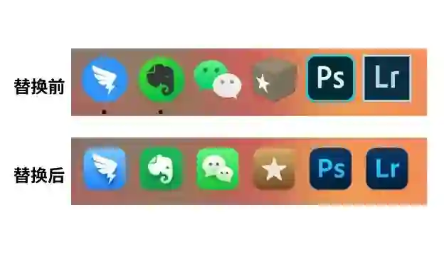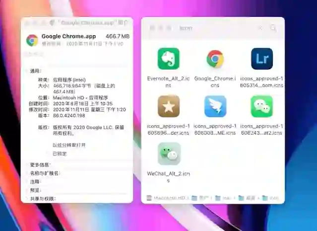 按照这个方法,你也可以将 macOS Big Sur 风格的图标替换为此前不规则设计的风格,不过由于这类图标暂时没有现成的合集,所以搜集的成本更大一些。