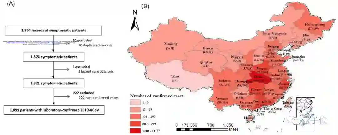 由于原报告的不完整性,缺少3例患者的核心数据集(包括临床结果和症状),因此报告从31个省(市)的552家医院中筛选出了1099例2019-nCoV ARD患者,如下图所示。