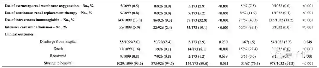 5例重症患者采用体外膜氧合,非重症患者未采用体外膜氧合(P<0.001)。