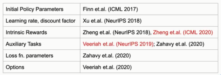 在强化学习中,策略(Policy)函数和价值(Value)函数的参数值通常从数据中学习得到。对于那些通常手动设置的参数,如图1所示,表格中是最新论文中的一些例子以及它们的出处。这些例子都是采用Meta-Gradient方法发现参数。有些通过元学习(Meta-Laring)发现一个好的策略参数初始值。有些是用Meta-Gradient方法发现学习率(Learing Rate)和折扣因子(Discount Factor)。有些是用Meta-Gradient方法发现内在奖励(Intrinsic Rewards)和辅助任务(Auxiliary Tasks)等。