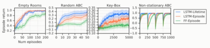 这个实验中的最优表现应该是:在生命周期的第一个Episode,智能体可以高效的探索整个房间来找到目标位置。当找到目标位置,则第一个Episode结束。从第二个Episode开始,智能体能够记住目标位置在哪并直接到达目标位置。
