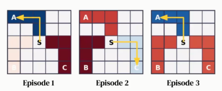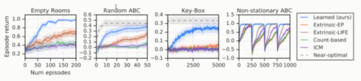 在这个实验中,我们希望学习到内在奖励函数可以捕获到的规律是:规避B,因为它总是不好的,同时可以快速的指出A和C到底哪个更好,并在剩下的生命周期内总是做出最好的选择。为了学到这些规律,智能体需要跨多个Episode进行探索学习。图8展示了不同的Episode中探索到的Object,图中每个方格代表每个轨迹中积累的内在奖励,蓝色代表正的奖励,红色代表负的奖励。可以看到在Episode 1中,推荐Object A,在Episode 2中推荐Object C,在Episode 3中推荐Object A,整个过程中都没有推荐Object B,它的颜色总是红的。