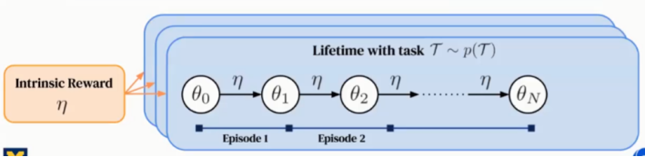 内部奖励(Intrinsic Reward):在一个生命周期内被用来训练智能体策略(Policy),策略不能看到外在奖励,只能利用内部奖励更新参数。