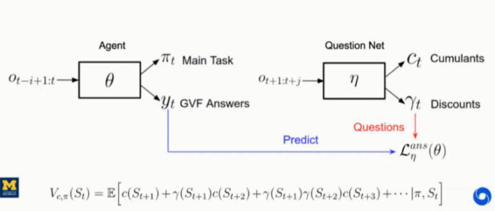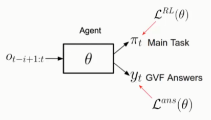 图14中展示的是通用辅助任务架构,以最近一次的观察作为输入,q为模型参数,输出为任务策略和预先定义的问题的回答(GVF)。